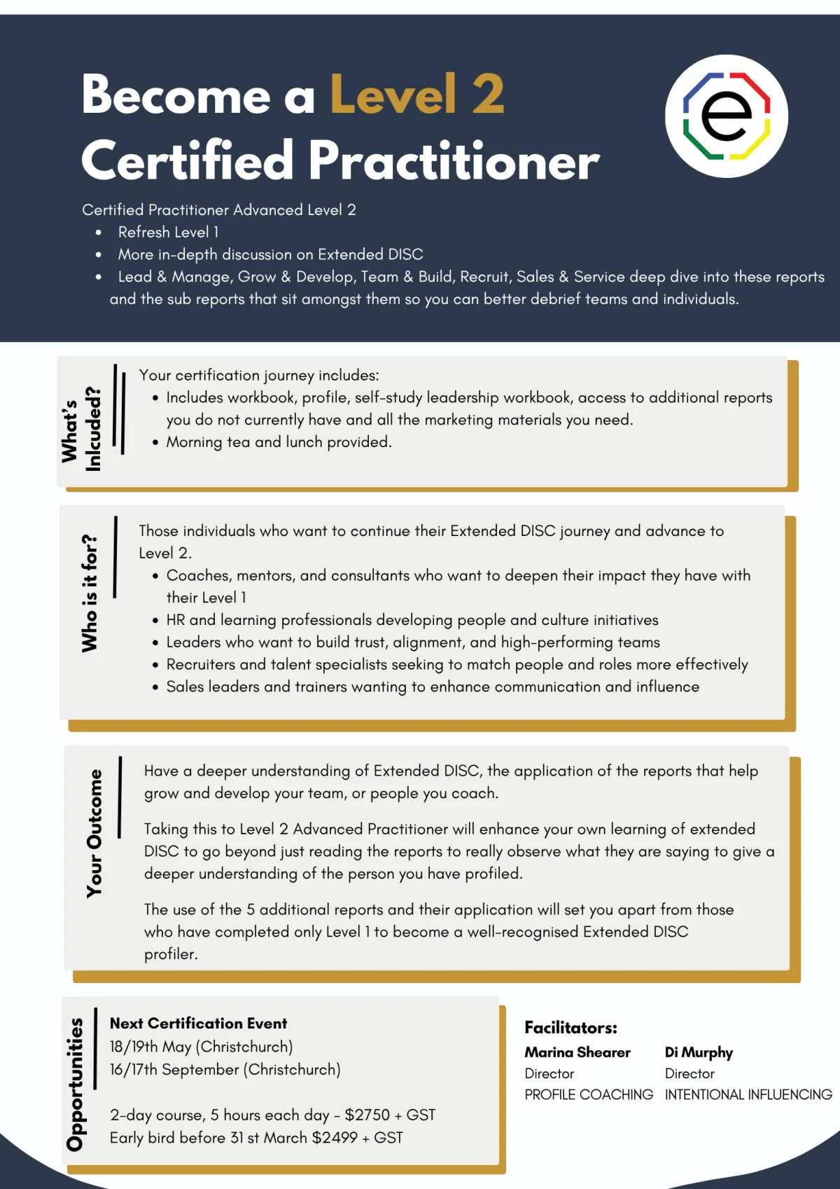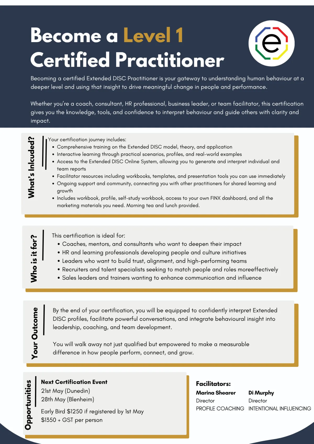By the end of your certification, you’ll be equipped to confidently interpret Extended DISC profiles, facilitate powerful conversations, and integrate behavioural insight into leadership, coaching, and team development. You’ll walk away not just qualified — but empowered to make a measurable difference in how people perform, connect, and grow.