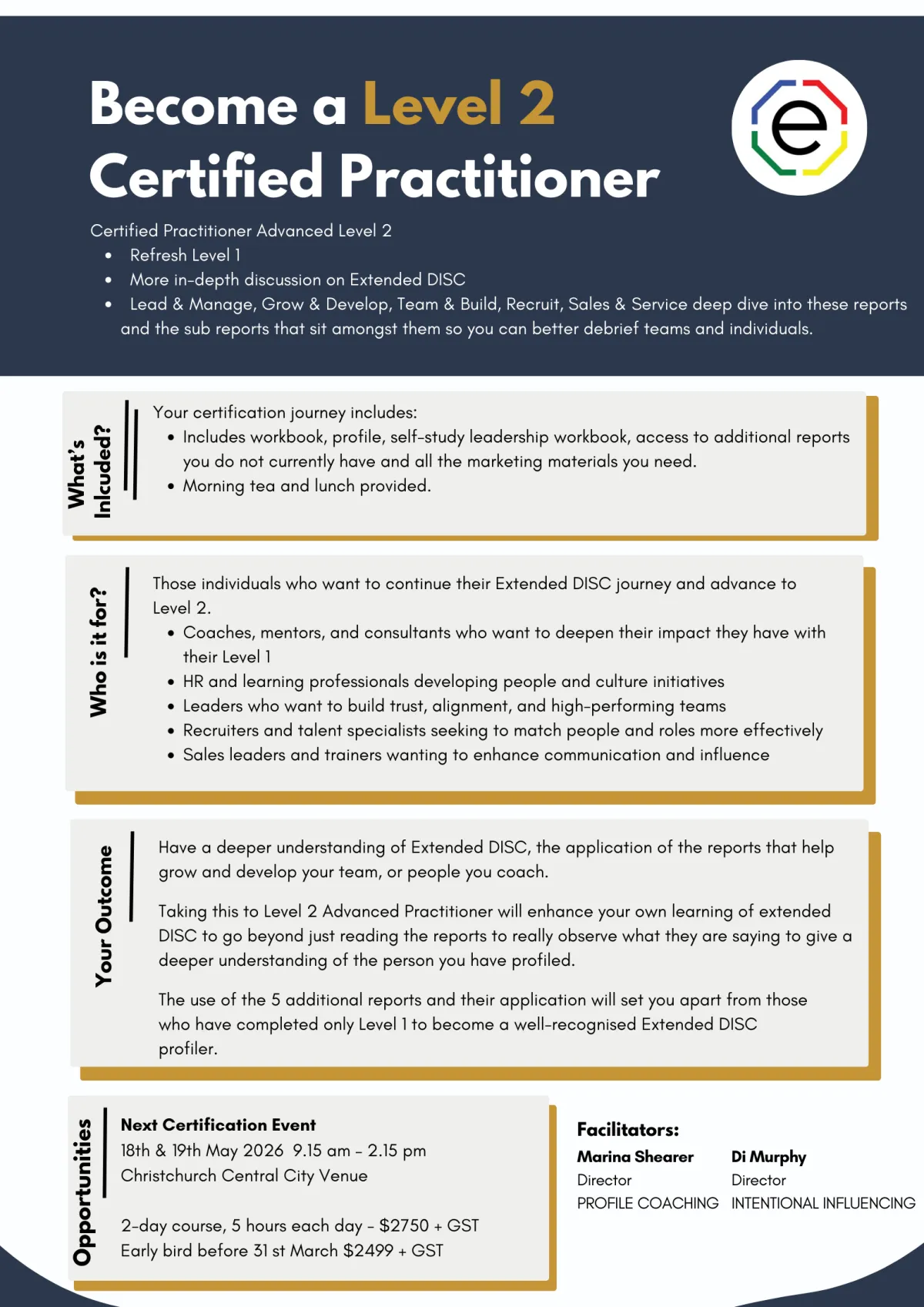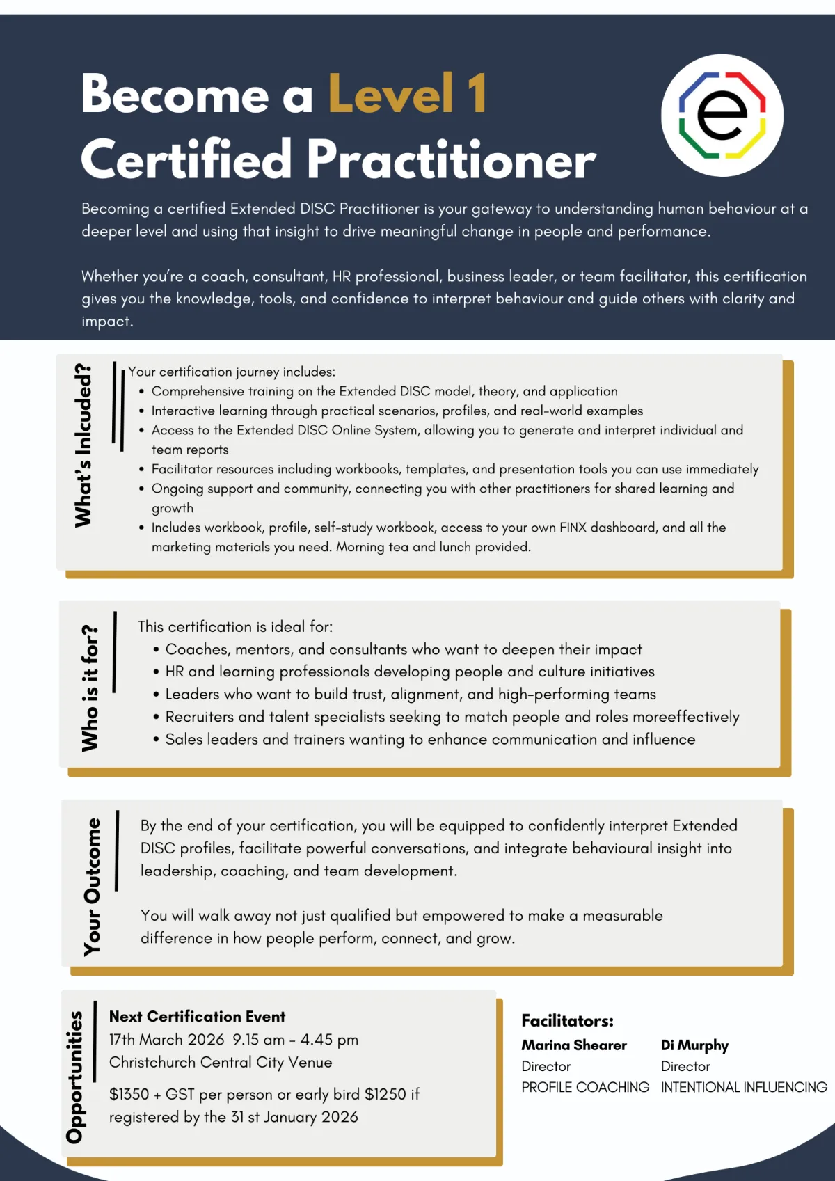 By the end of your certification, you’ll be equipped to confidently interpret Extended DISC profiles, facilitate powerful conversations, and integrate behavioural insight into leadership, coaching, and team development. You’ll walk away not just qualified — but empowered to make a measurable difference in how people perform, connect, and grow.